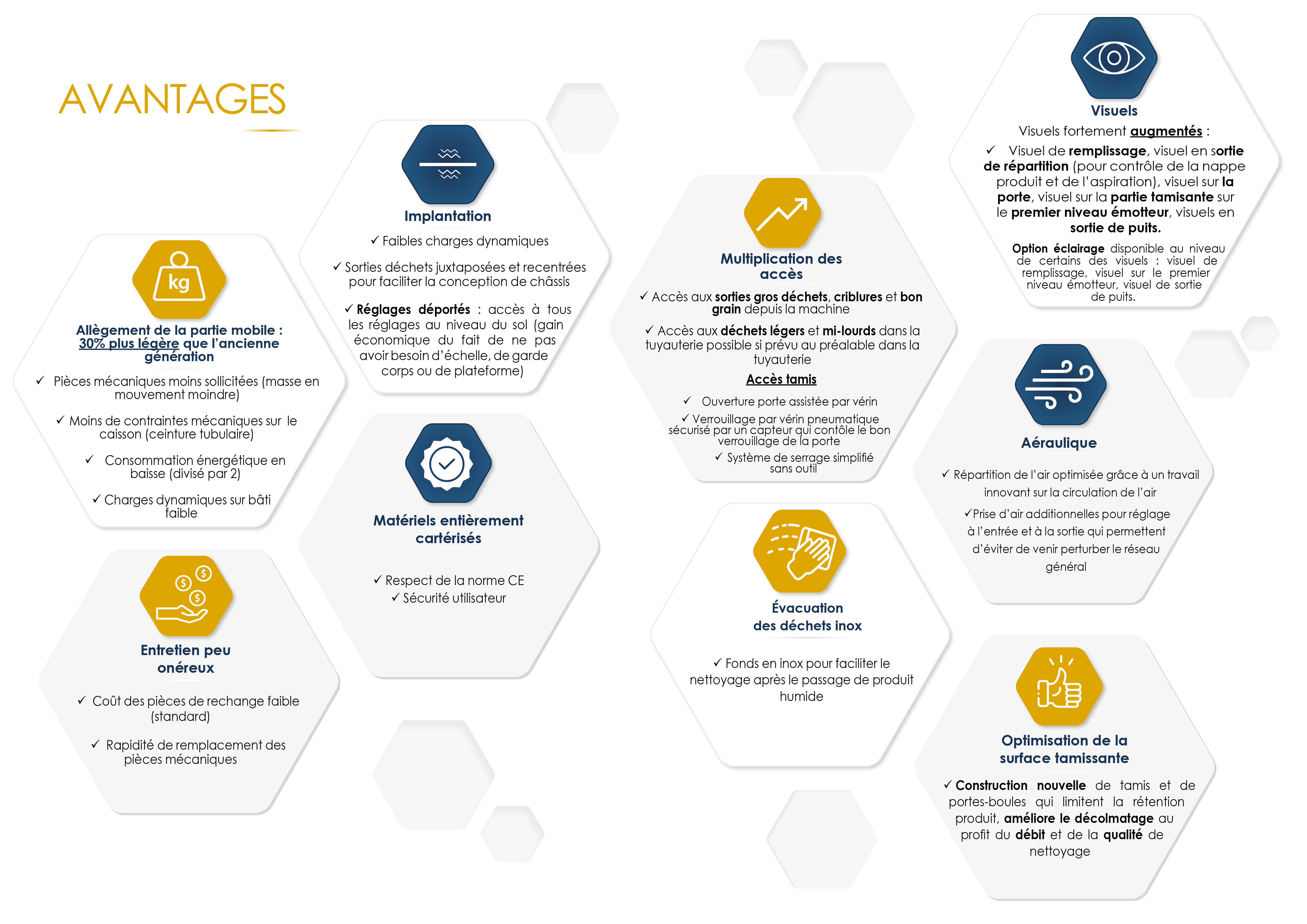 2– Il contient quatre tamis émotteurs qui, par traversée du bon produit, retiennent les gros déchets ou calibres supérieurs pour les diriger vers les sorties gros déchets.